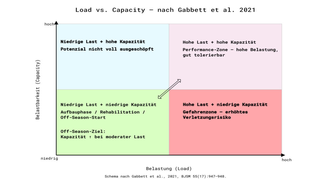 Tim Gabbett und Kollegen beschreiben das Zusammenspiel von Belastung (Load) und Belastbarkeit (Capacity) als Quadrantenmodell: Viel Belastung bei niedriger Kapazität bedeutet hohes Verletzungsrisiko, während hohe Belastung bei hoher Kapazität deutlich besser toleriert wird.[4]