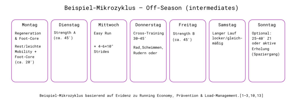 In der Off-Season stehen Schwellen- und VO₂max-Training nicht im Mittelpunkt. Wichtiger ist ein reduziertes, gut verträgliches Volumen mit kleinen Qualitätsreizen, das Raum lässt für Krafttraining, Foot-Core und Alltag.