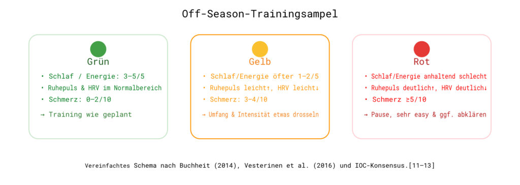 Ein einfaches Monitoring der Belastung (Session-RPE×Dauer) und des Schlafes – optional ergänzt um Herzratenvariabilität und Ruhepuls – hilft, die Off-Season trendbasiert zu steuern.[11,12]