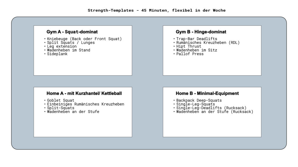 Die Grundidee sind zwei Kraft-Einheiten pro Woche, die sich wie Bausteine in jede Off-Season-Woche einfügen lassen – je nachdem, ob das Training im Gym oder zuhause stattfindet. Jede Session dauert ungefähr 45-60 Minuten und basiert auf fünf klaren Grundübungen. Für alle, die kein Studio-Abo haben oder viel unterwegs sind, gibt es passende Home-Varianten mit wenig Equipment. Die Gym-Templates A und B können im Wochenrhythmus einfach abgewechselt werden, zum Beispiel Dienstag: Gym A, Freitag: Gym B. Gleiches Prinzip für die Home-Varianten – A und B im Wechsel, angepasst an Wochenplan und Alltagsstress.